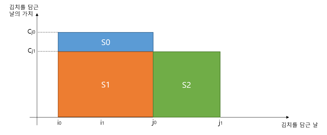 그림에서, i0번째 날에 담근 김치를 j0번째 날에 김치를 꺼냈을 때 가치는 S1 + S0 이고,