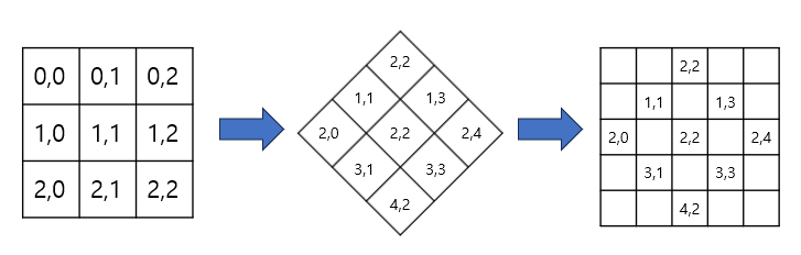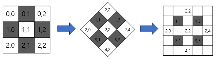 좌표변환에는 (y', x') = (y+x, n-1-y+x) 와 같은 적당한 변환식을 이용한다.